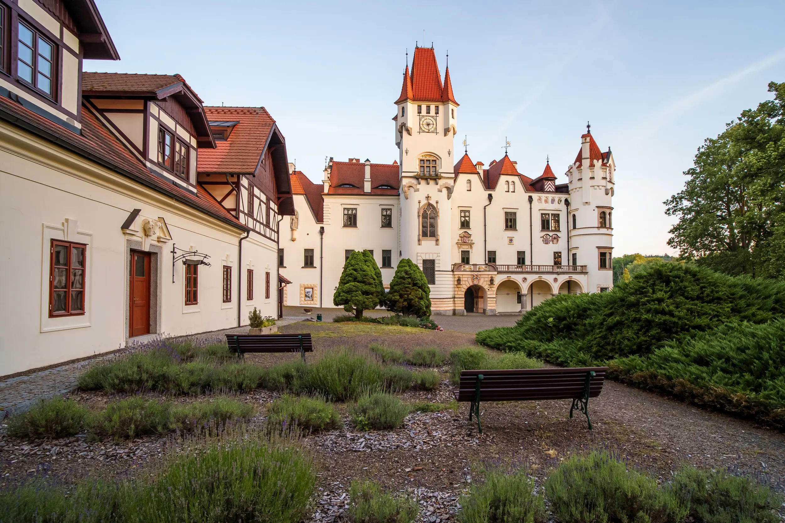 1897 erstand der Wiener Architekt Karl von Wessely das Schloss Žinkovy. Kurz danach erhielt es eine pseudostilistische Gestalt mit Erkern, Giebeln und Türmen. Je nachdem von welcher Seite man das romantische Schloss betrachtet, sieht es immer anders aus. Er scheint, als ob es sich um verschiedene Objekte handelt. Und doch sind die einzelnen Teile harmonisch miteinander verbunden. Das Schloss ist von einem Park mit dem Žinkover See umgeben.